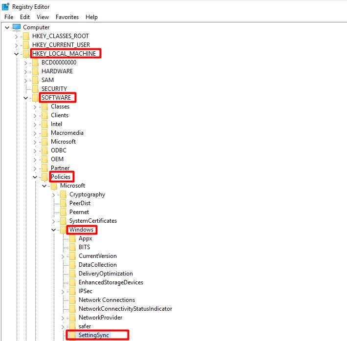 الخطوة 3:يبحث "HKEY_LOCAL_MACHINEسياسات البرامجMicrosoftWindowsSettingsSync" موقع.