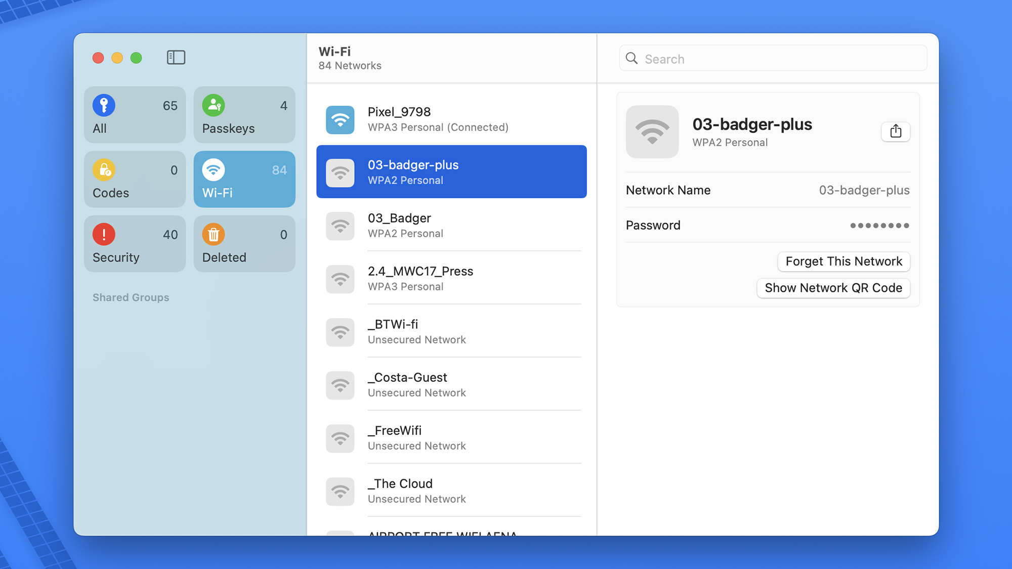 ستجد أداة كلمات المرور في جزء التطبيقات في Finder، أو يمكنك تشغيلها من Spotlight. يمكن إدارة أنواع مختلفة من عمليات تسجيل الدخول، بما في ذلك رموز المرور ورموز المصادقة، ويحذرك التطبيق من كلمات المرور المخترقة أيضًا.