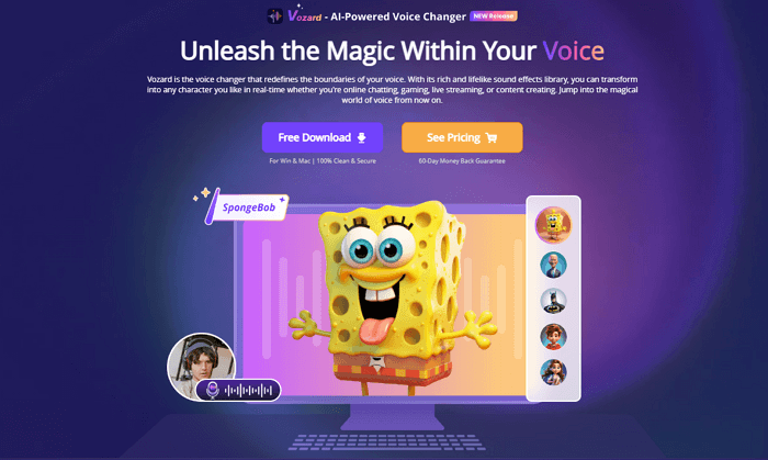 أولاً، ننصحك بتجربة Vozard لتغيير صوتك. يعمل برنامج تغيير الصوت هذا على تشغيل العديد من التأثيرات الصوتية عالية الجودة VST وAI، بما في ذلك الذكور والإناث والمشاهير والوحوش وأكثر من 180+ لتحويل صوتك في الوقت الفعلي. كما أن لديها تأثير صوت SpongeBob المتوفر في مكتبة المؤثرات الصوتية الخاصة بها.