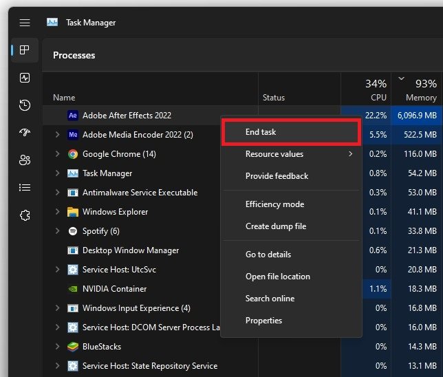 مرة أخرى فيالعملياتقسم الخاص بكمدير المهام، يمكنك أيضًا منع تشغيل بعض العمليات كثيفة الاستخدام للموارد، ولكن تأكد من إنهاء تشغيل العمليات التي تعلم أنها لن تؤدي إلى تعطيل نظام التشغيل الخاص بك فقط. ستستهلك التطبيقات مثل Google Chrome أو OBS أو Adobe بشكل خاص معظم الذاكرة المتوفرة لديك وتتسبب في حدوث تأخير أثناء استخدام Bluestacks.
