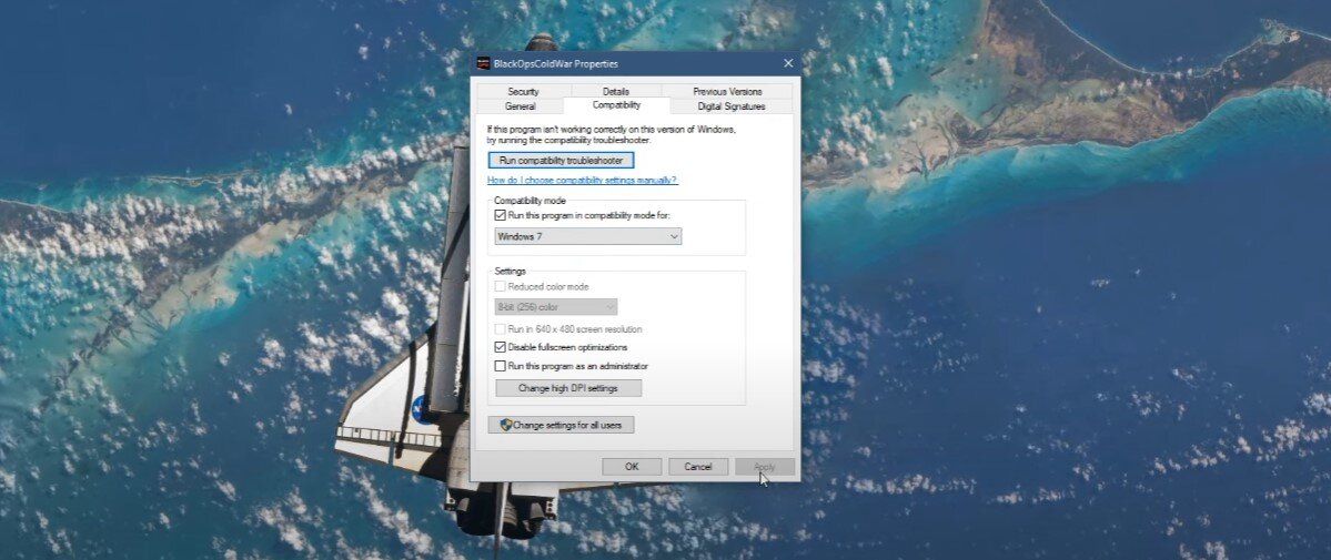 أخيرًا، افتح File Explorer وانتقل إلى محرك الأقراص الذي قمت بحفظ اللعبة عليه. اذهب الىملفات البرنامج،وفي مجلد Call of Duty Black Ops Cold War، انقر بزر الماوس الأيمن فوق تطبيق Black Ops Cold War ذو الحجم الأكبر للملف. يختارملكيات. فيالتوافقعلامة التبويب، قم بتشغيل البرنامج في وضع التوافق لـويندوز 7، وتعطيل تحسينات ملء الشاشة. لا تنس تطبيق التغييرات الخاصة بك.