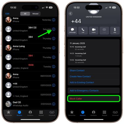 - حدد موقع المكالمة غير المرغوب فيها التي تلقيتها في القائمة وانقر على أيقونة المعلومات (الحرف الصغير "i" المحاط بدائرة) بجوارها.