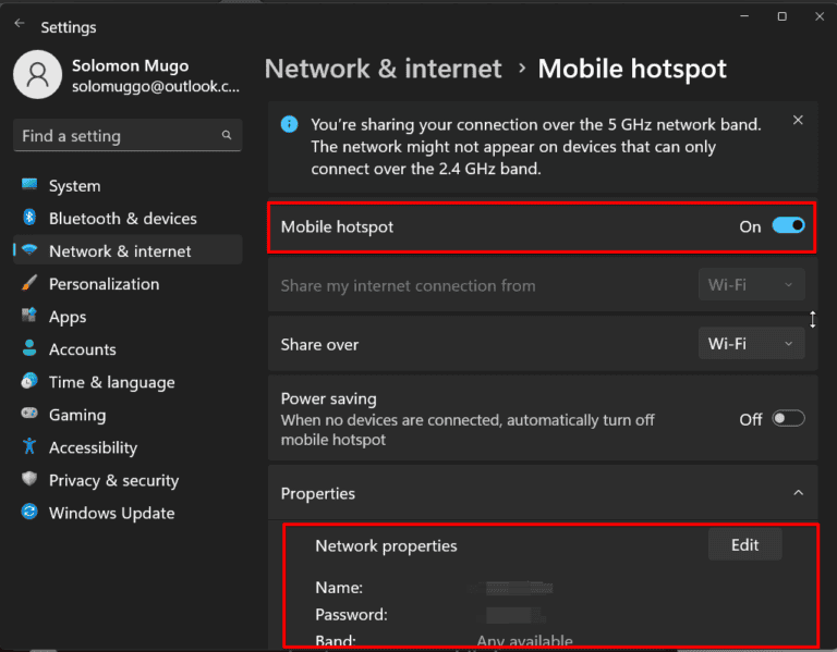 - تشغيل "نقطة اتصال متنقلة" وانقر فوق "يحرر" لتغيير اسم الشبكة وكلمة المرور.