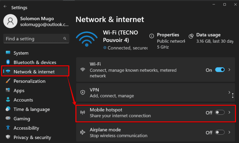 - اذهب الىإعدادات>الشبكة والإنترنت>نقطة اتصال متنقلةعلى جهاز الكمبيوتر الخاص بك.