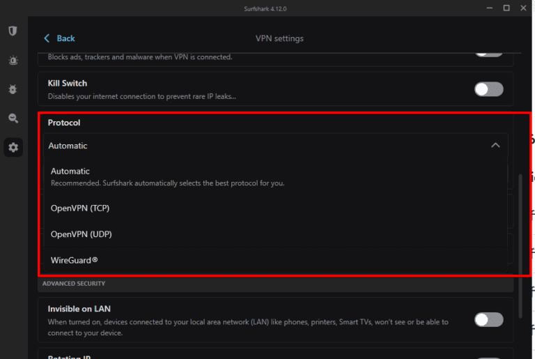 - اتصل ببروتوكول Surfshark المناسب. أوصي بالاتصال بـبروتوكول WireGuardلتوازنه الممتاز بين السرعة والأمان وزمن الوصول المنخفض. لاختيار البروتوكول، انتقل إلىإعدادات>إعدادات VPN>بروتوكول.
