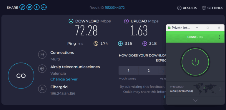 لقد أجريت اختبارات السرعة أثناء اتصالي بخادم PIA Spain – فالنسيا، وبلغ متوسط سرعة بروتوكول WireGuard 72 ميجابت في الثانية على شبكة تبلغ سرعتها 100 ميجابت في الثانية.