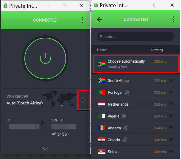 - النقر على خادم PIA المفضل لديك للاتصال.