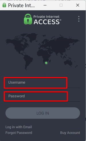 - قم بتسجيل الدخول إلى تطبيق PIA Android باستخدام بيانات الاعتماد الخاصة بك (اسم المستخدم، كلمة المرور).
