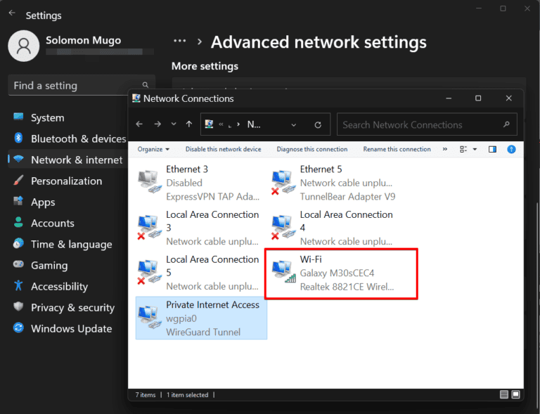 - انقر فوق "المزيد من خيارات محول الشبكة"وتأكد من الضوء الأخضر تحت"Wi-Fi" قيد التشغيل.