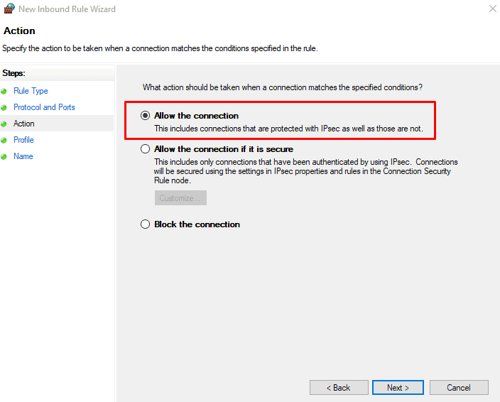 - يختار "السماح بالاتصال"، ثم انقر فوق "التالي.”