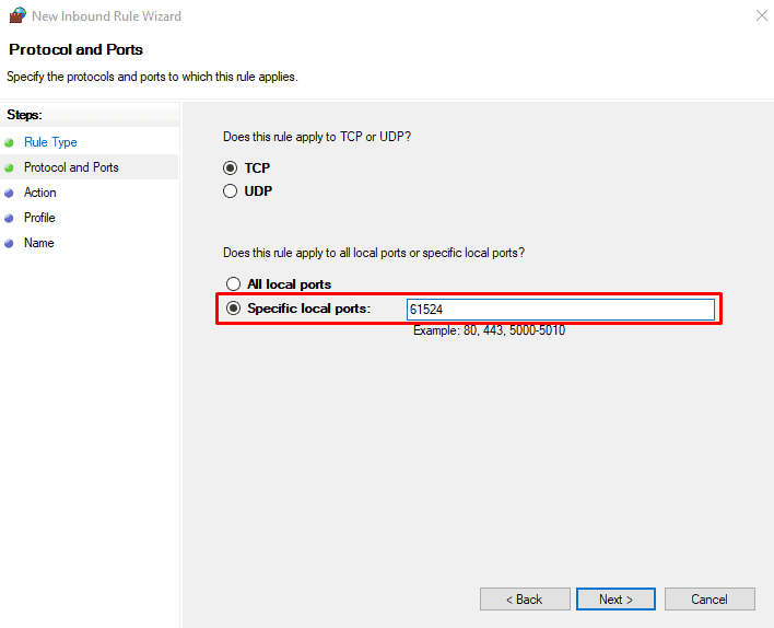- يختار "برنامج التعاون الفني"، ثم أدخل رقم منفذ PrivateVPN (61524) بجوار "منافذ محلية محددة". انقر فوق "التالي.”