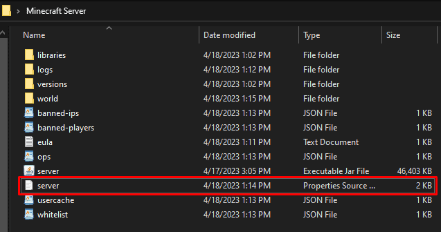ينبثق منفذ الخادم الخاص بك بعد الاتصال- افتح مجلد خادم Minecraft على جهاز الكمبيوتر الخاص بك وانقر فوقserver.properties.