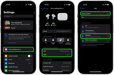 يمكنك أيضًا التبديل إلى Adaptive Audio من خلال الضغط لفترة طويلة على الزر، ولكن عليك أولاً تعيينه لعناصر التحكم في AirPods Pro 2، كما يلي:
