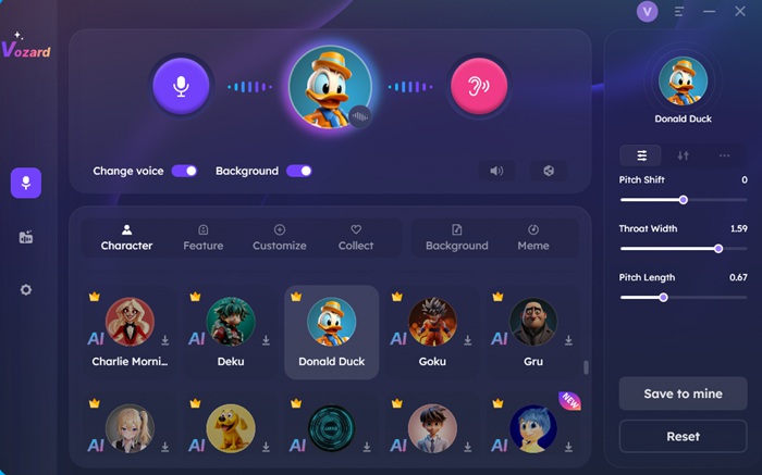 أول واحد في قائمتنا هو Vozard، وهو مغير صوت في الوقت الحقيقي مدعوم بالذكاء الاصطناعي. تم تطبيق Vozard مع أكثر من 180 مؤثرًا صوتيًا، وأصبح واحدًا من أفضل برامج تغيير الصوت للمستخدمين للحصول على صوت دونالد داك. إلى جانب صوت دونالد داك، يمكنك نقل صوتك إلى شخصيات مشهورة مثل Batman وJigsaw وMinions with Vozard.