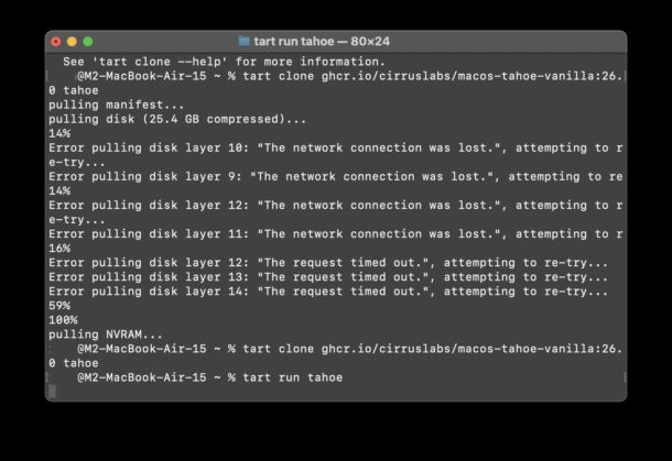 بشكل منفصل، عند محاولة استنساخ أو تنزيل صورة MacOS Tahoe التجريبية مع تورتة، قد ترى مجموعة متنوعة من رسائل الخطأ مثل ما يلي: