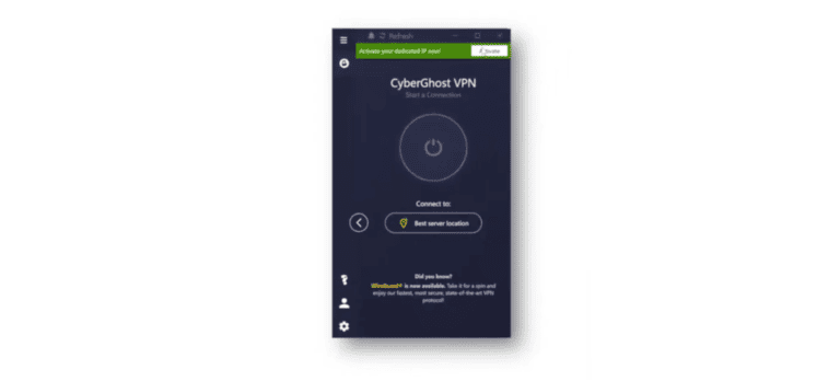 - افتح تطبيق CyberGhost على جهازك المفضل. ستجد شريط إشعارات أخضر اللون به “قم بتفعيل عنوان IP المخصص الخاص بك الآن!”