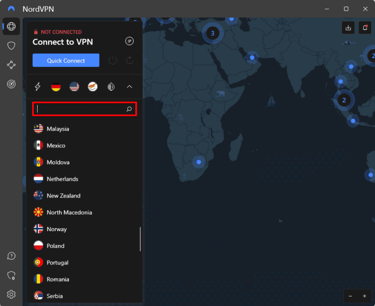 - انقر فوقأيقونة الكرة الأرضيةفي لوحة القائمة اليسرى للوصول إلى القائمة الكاملة لمواقع خادم NordVPN.