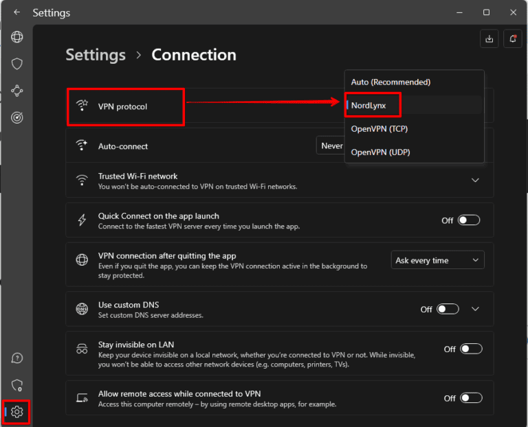 - اتصل ببروتوكول NordLynx لسرعاته العالية وأمانه المضمون. اذهب الىإعدادات>اتصال>بروتوكول VPN>نوردلينكس.