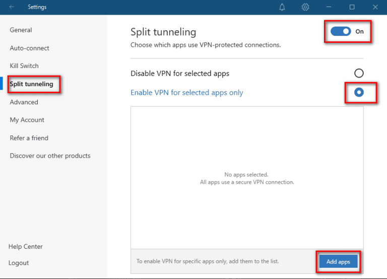 - انقرتقسيم الأنفاقمن القائمة اليسرى، ثم قم بتمكين الإعداد باستخدام زر التبديل الموجود أعلى النافذة. يضمنتمكين VPN للتطبيقات المحددة فقطتم تحديده. يختارإضافة تطبيقات.