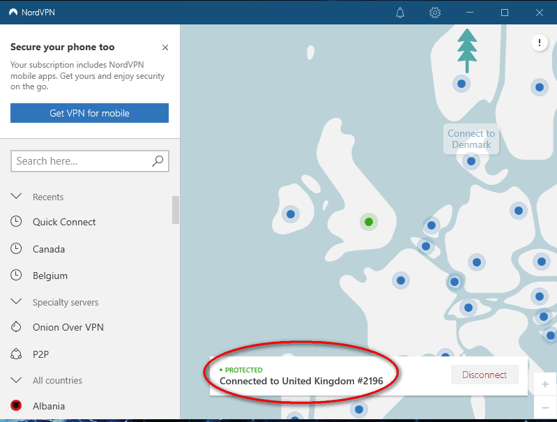 سيؤدي تمكين NordVPN والاتصال بخادم في المملكة المتحدة إلى القضاء على هذه المشكلة، وسوف تتسلل عبر الشبكة، مما يجعل خوادم BBC تعتقد أنك دافع لترخيص التلفزيون في المملكة المتحدة (وأنت لست كذلك).