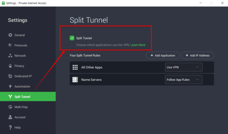 - استخدام تقسيم الأنفاق: يمكنك توجيه تطبيقات أو أجهزة معينة من خلال اتصال PIA VPN، مما يؤدي إلى تحرير النطاق الترددي لتطبيق Plex الخاص بك. أو قم بتمرير Plex خارج VPN إذا لم تكن بحاجة إلى PIA لذلك في ذلك الوقت.
