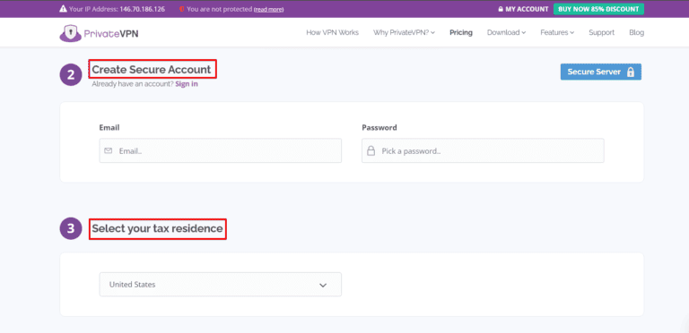 - إنشاء أحساب PrivateVPNعن طريق إدخال عنوان بريدك الإلكتروني وكلمة مرور آمنة. بالإضافة إلى ذلك، حدد بلدك للأغراض الضريبية.