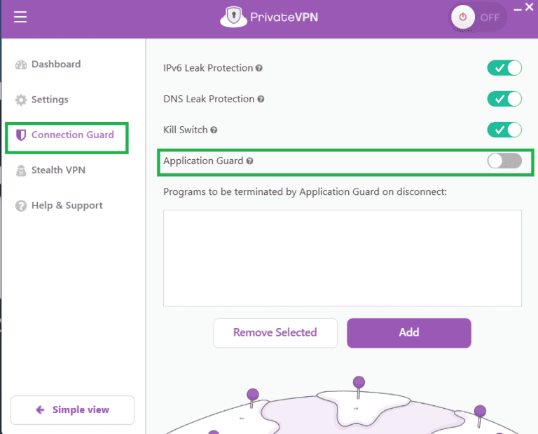 عادةً ما تحتوي معظم شبكات VPN على مفتاح إيقاف واحد، ولكنPrivateVPNيحتوي أيضًا على مفتاح إيقاف التطبيق يسمىحارس التطبيق. يمكن تكوين هذا لتعطيل بعض التطبيقات بشكل صارم، بدلاً من الإنترنت بالكامل، بمجرد انقطاع اتصال VPN.