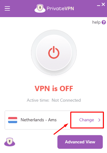 - انتقل إلى الشاشة الرئيسية للتطبيق وحدد "يتغير"لعرض قائمة خوادم PrivateVPN.