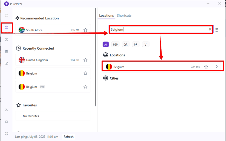 - انتقل إلى PureVPNرمز الكرة الأرضيةواكتب "بلجيكا" في شريط البحث. انقر للاتصال بخادم PureVPN في بلجيكا.