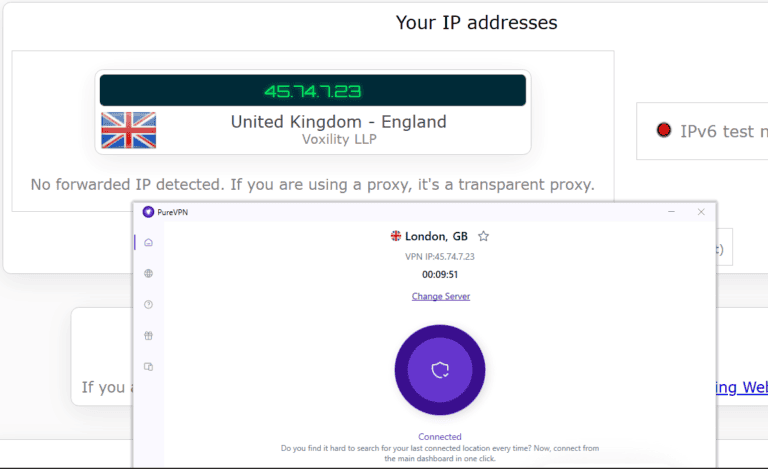 - اختبار التسريبات علىwww.ipleak.netلتأكيد اتصال VPN الآمن الخاص بك. تأكد من أن عنوان IP الخاص بـ PureVPN يطابق العنوان الموجود في موقع اختبار التسرب.