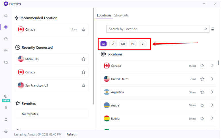 قد تكون PureVPN خوادم IP مخصصة في فلوريدا ولكنها لا تسمح للمستخدمين باختيارخادم IP مخصصالدولة أو المدينة. لذلك، قد يتم تخصيص عنوان IP مخصص لفلوريدا لك بشكل عشوائي إذا قمت بتحديد الولايات المتحدة كموقعك المفضل.