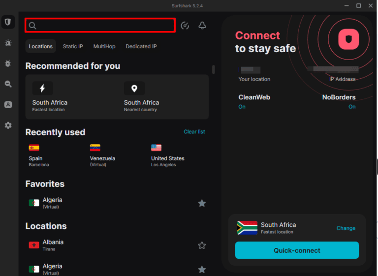 - اتصل بخادم Surfshark المناسب الذي يتجاوز حظر BTK على X (Twitter سابقًا) وFacebook في تركيا. استخدمشريط البحثللاتصال بخادم Surfshark محدد.