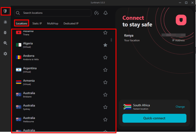 يقدم Surfshark أيضًاعنوان IP تركيلتأمين معاملاتك عبر الإنترنت في Ziraat Bankasi أثناء استخدام شبكة Wi-Fi العامة لمطعم Guntaylar في إسطنبول أو الاتصال بنظراء الألعاب الأتراك في مرسين.