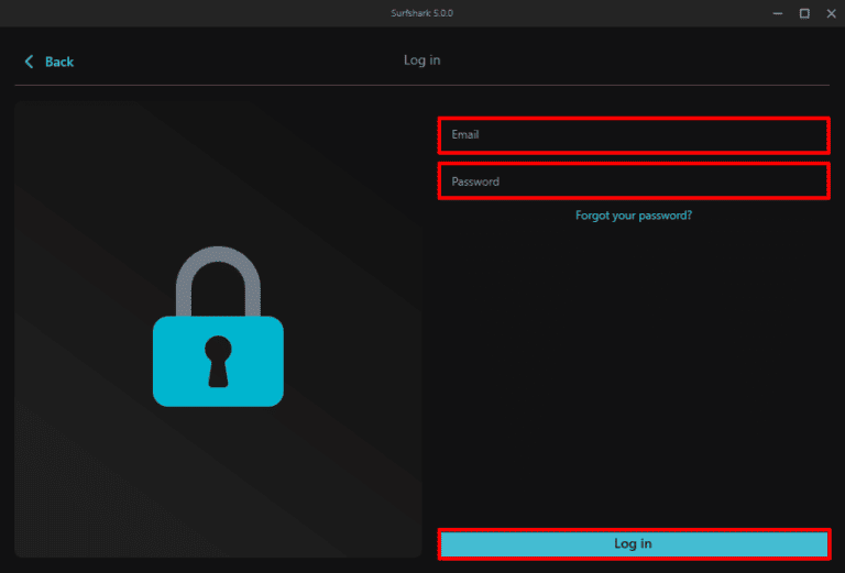 - قم بتسجيل الدخول إلى تطبيق Surfshark Windows باستخدام عنوان البريد الإلكتروني وكلمة المرور.