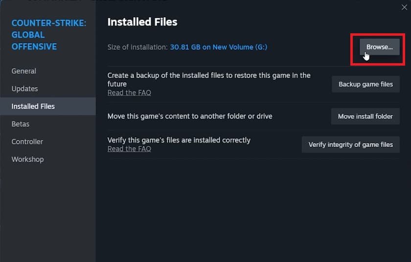 قم بالوصول إلى خصائص اللعبة وحدد موقع قسم "الملفات المثبتة". انقر فوق "استعراض" لفتح مستكشف الملفات الخاص بك، والذي سيعرض جميع ملفات CS2 الموجودة لديك.