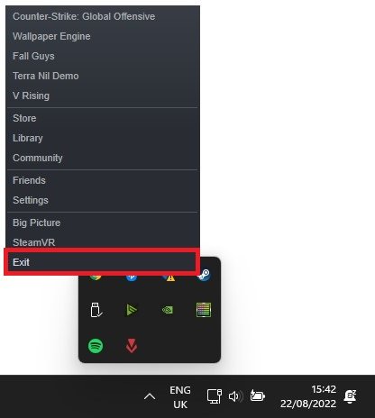 في معظم الحالات، يحدث خطأ CSGO VAC بسبب اتصال شبكة غير موثوق به، وليس بسبب قيام Valve Anti Cheat بحظر حسابك. أولاً، أغلق CSGO وSteam Launcher. بعد ذلك، افتح علبة النظام، وانقر بزر الماوس الأيمن فوقبخارأيقونة، ثم اخترمخرجللخروج بالكامل من التطبيق.