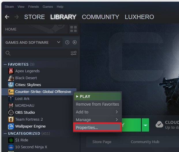 عند الانتهاء من ذلك، يمكنك المتابعة لإعادة فتح مشغل Steam الخاص بك. في الخاص بكمكتبة البخاروحدد موقع CSGO وانقر بزر الماوس الأيمن فوق اللعبة للوصول إلى خصائصها.