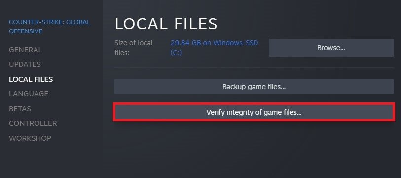 خصائص CSGO > الملفات المحلية > التحقق من سلامة ملفات اللعبة...