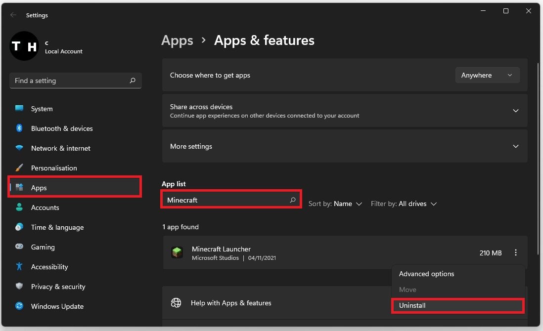 إعدادات Windows > التطبيقات > التطبيقات والميزات > Minecraft Launcher