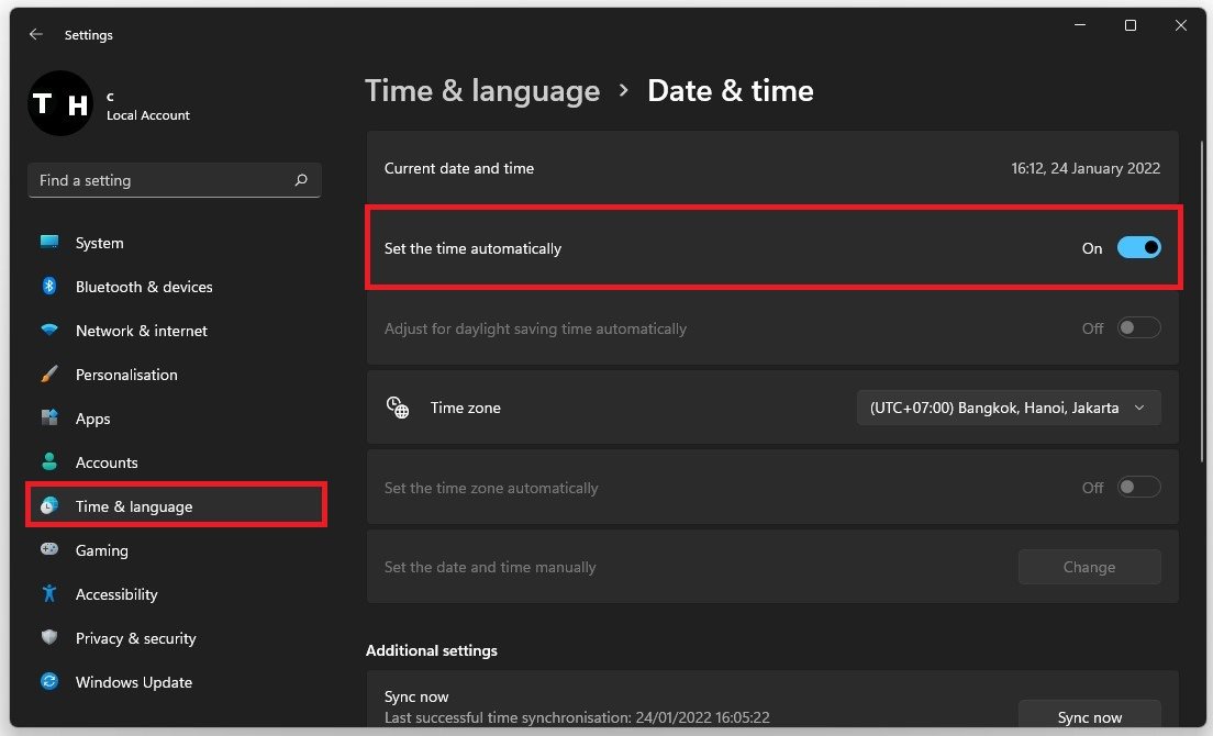 انتقل إلىالوقت واللغةعلامة التبويب في الإعدادات الخاصة بك وانقر فوقالتاريخ والوقت. تأكد مناضبط الوقت تلقائيًاتم تمكين الخيار. إذا كان هذا هو الحال بالفعل، فقم بإلغاء تحديد هذا الخيار وإعادة تحديده.