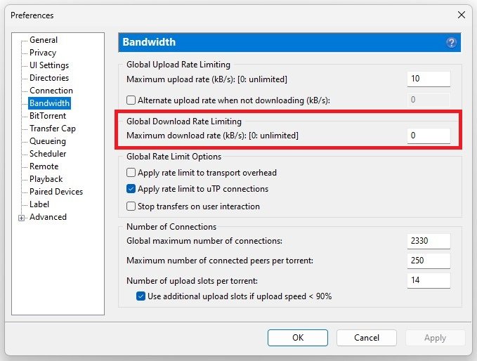 تفضيلات uTorrent > النطاق الترددي > الحد الأقصى لمعدل التنزيل