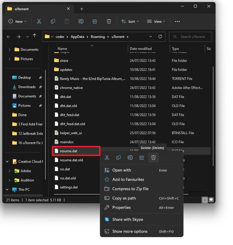 عندما يتم ذلك، ابحث عن%بيانات التطبيق%في قائمة ابدأ، ابحث واضغط على زر الإدخال. سيتم فتح مجلد جديد. من هنا انتقل إلىيوتورنتوحذفاستئناف.DATملف. سيؤدي هذا إلى إعادة إنشاء الملف بمجرد إعادة فتح برنامج uTorrent، وسيؤدي في كثير من الحالات إلى إصلاح المشكلةالاتصال بالأقرانمشكلة.