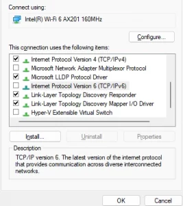 3. في علامة التبويب "الشبكة"، قم بإلغاء تحديد المربع الموجود بجوار الإصدار 6 من بروتوكول الإنترنت (IPv6) وانقر فوق "موافق".