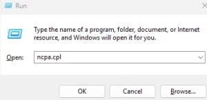 1. اضغط على مفتاح شعار Windows + R على لوحة المفاتيح، واكتب ncpa.cpl، ثم اضغط على Enter.
