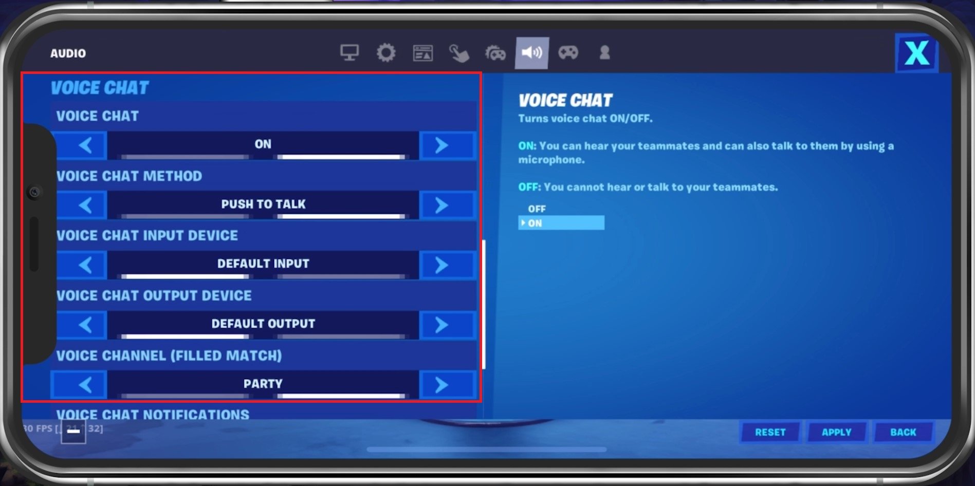 تحتالدردشة الصوتية، تأكد من تمكينالدردشة الصوتيةخيار. يمكنك بعد ذلك اختيار أالدردشة الصوتيةطريقة. يجب ضبط هذا علىاضغط للتحدث. يمكنك أيضًا استخدامافتح الميكروفونمما يزعج معظم اللاعبين في الردهة الخاصة بك. تأكد من الخاص بكالإدخال والإخراج الافتراضيتم ضبط الجهاز على الجهاز الذي ترغب في استخدامه. يمتلك بعض المستخدمين سماعات رأس أو ميكروفونات خارجية يفضلون استخدامها. بعد تطبيق التغييرات، يجب أن تعمل الدردشة الصوتية في Fortnite mobile.