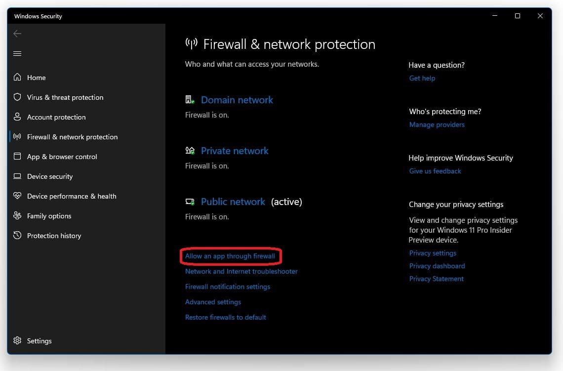 تأكد من أن جدار الحماية الخاص بك لا يحظر أجزاء من البرنامج. ابحث عن جدار الحماية في بحث شريط المهام لفتح ملفكجدار الحماية وحماية الشبكةنافذة إعدادات النظام.