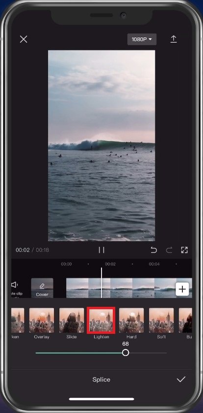 حدد خيار Splice من أسفل الشاشة لتوصيل التراكب الأسود بالفيديو الخاص بك. مرة أخرى، تأكد من أن الصورة السوداء قد غطت الفيديو بالكامل قبل المتابعة. على الشاشة التالية، سيكون هناكفلترخيار. سوف تظهرالعتامةفلتر. للحصول على أفضل النتائج، قم بتعيين خاصية عتامة الفيديو على40.