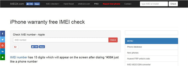 مدقق رقم IMEI عبر الإنترنت والذي يتميز بالكفاءة العالية هو IMEI24.com. أدخل الرقم المكون من 15 رقمًا على شاشة هاتفك عند الاتصال بـ *#06# على برنامج الاتصال الخاص بك. هذا هو كل ما هو مطلوب منك. يقدم هذا الموقع ثروة من البيانات حول iPhone وتفاصيل حول الشبكة.