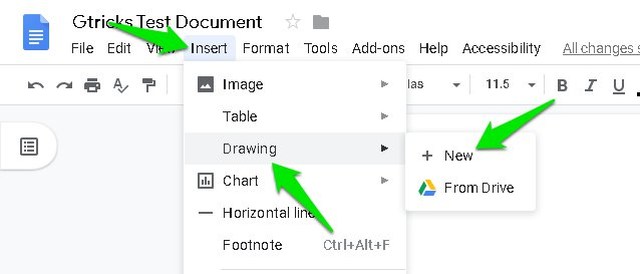 1. في مستند Google Docs، انقر فوق"إدراج"القائمة واختيار"جديد"من"رسم"خيار.