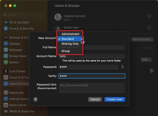انقر فوقإضافة حسابلإنشاء مستخدم جديد بعد إدخال كلمة مرور المسؤول الخاصة بك. يمكنك بعد ذلك تحديد إنشاء حساب قياسي أو حساب مسؤول ثانٍ. عند ضبط هذا علىالمشاركة فقط، سيكون لدى المستخدم وصول محدود إلى جهاز Mac الخاص بك. ستتمكن من تحديد الملفات والمجلدات التي يستطيع حساب المشاركة فقط الوصول إليها.